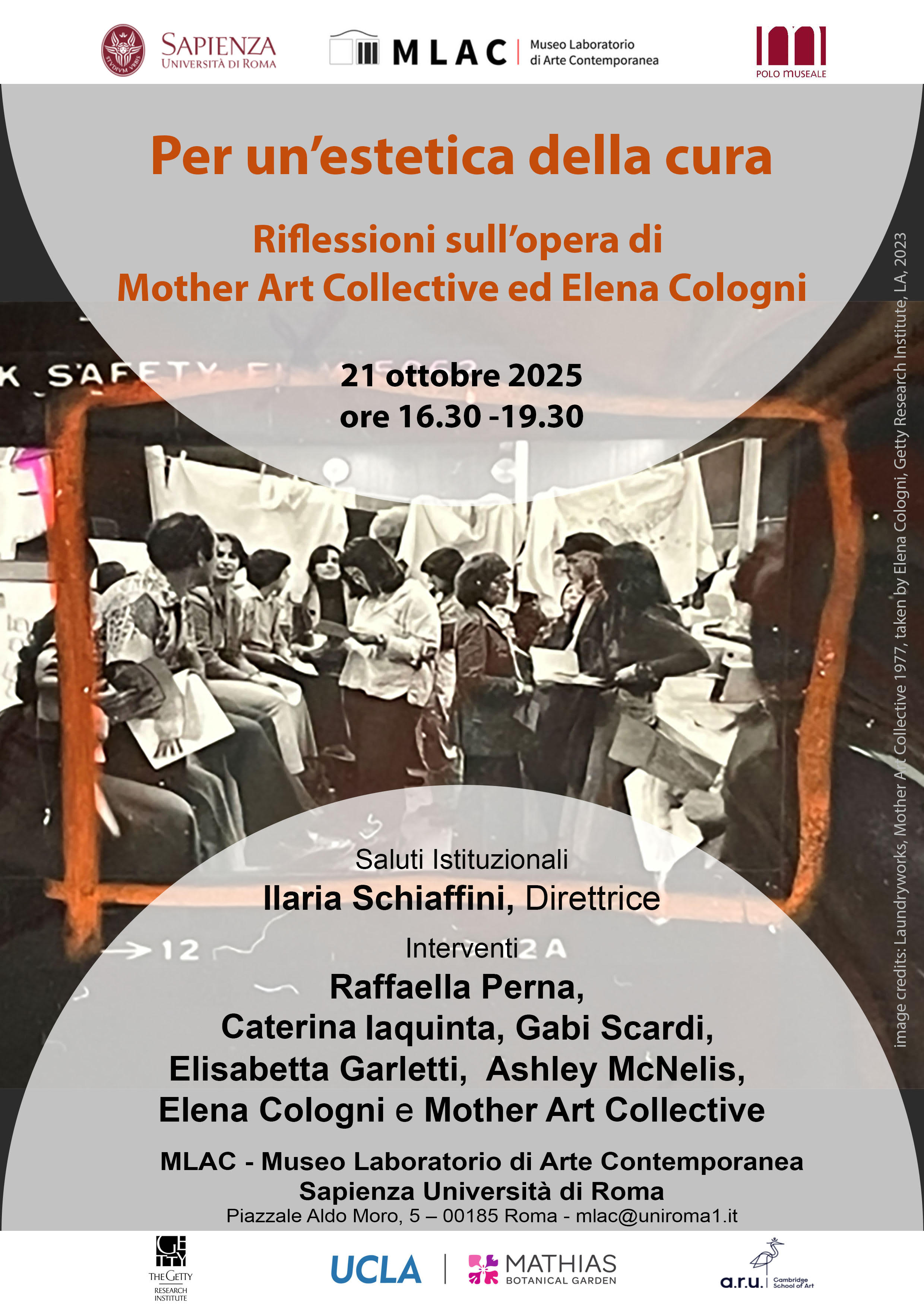 Martedì 21 ottobre alle ore 16:30, presso il Museo Laboratorio di Arte Contemporanea della Sapienza Università di Roma, si terrà l’incontro Per un’estetica della cura. Riflessioni sull’opera di Mother Art Collective ed Elena Cologni, un momento di approfondimento e dialogo a partire dalla mostra From the Home to the Planet, attualmente in corso al MLAC.